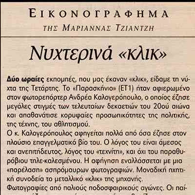 Θυμάμαι έντονα το εργαστήριο - αρχείο του, μια τρύπα σε έναν όροφο στον οδό Θεμιστοκλέους. Ήταν σαν κουκλόσπιτο, γεμάτο από φωτογραφίες στους τοίχους, χιλιάδες άλλες που ήταν στοιβαγμένες σε ντάνες, κουτιά από φιλμ, φωτογραφικές μηχανές, τριπόδια, φίλτρα, σκάφες για το εμφανιστήριο, βραβεία και διακρίσεις που κέρδισε όλα τα χρόνια της επαγγελματικής του πορείας κ.λ.π.