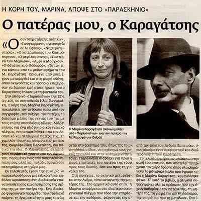 I first met Marina Karagatsis in the fall of 2007. Kostis Skalioras had introduced her to me as a valuable contributor for the portrait on Christine Tsingos.