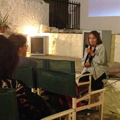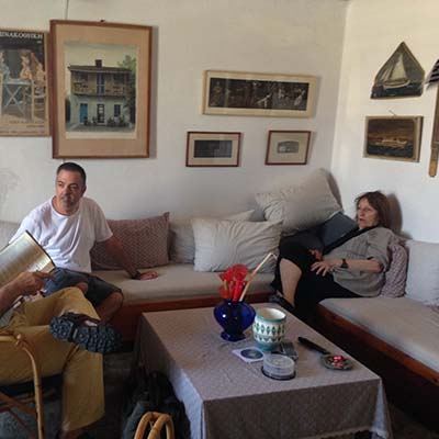As the shooting progressed, I realized that the subject matter was Marina herself, and the family entangled web around her; her, her domineering father and her oppressed mother, the great painter Niki Karagatsi. I figured out that the spirit and the character of Karagatsis would be illustrated much more convincingly through the disentangling of this intricate family web, rather than through a traditional literary portrait. Once I knew that Marina was prepared to be open and go on camera with almost psychoanalytical confessions, I decided to do away with the footage from the conference or with any other interview on Karagatsis, besides Marina’s. She had just finished an autobiographical short story entitled “To Efcharistimeno” (“Pleased”), by means of which she attempted to address her family history. The family house on Andros served as the background for the book.