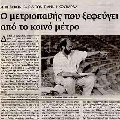 I filmed him during rehearsals for the “Tales from the Vienna Woods”, by Ödön von Horvath, which was intended for the Athens Festival. In addition to the rehearsals, I followed him around the old building of the National theatre, which was being refurbished. He was still uncomfortable in his new function, and that was manifested by a slightly comic incident. One of the workers was carrying a load and almost fell on Houvardas as he was speaking on camera. That was not only funny, but also indicative of the fact that he was neither here nor there. During that period, he was like a guest in his own house. The transition from the Amore theatre to the National theatre was sudden and abrupt.